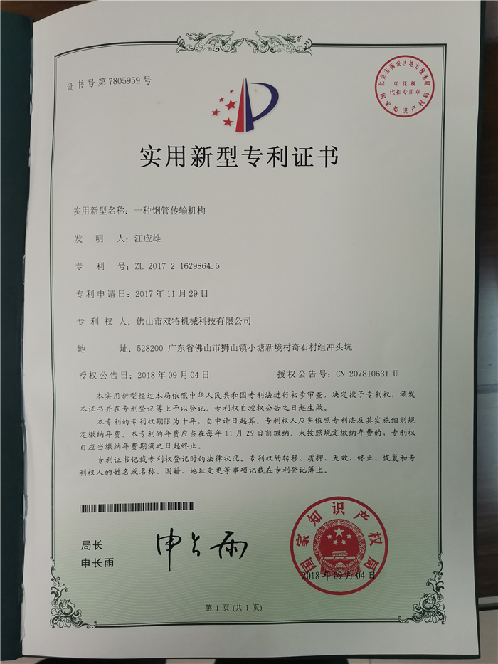 雙特制管機(jī)專(zhuān)利證書(shū)